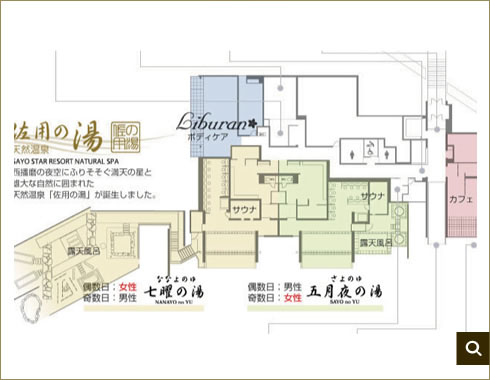 綺麗な夜空を眺めつつ、趣きを凝らしたお湯にゆったりと身体をゆだねれば、この上ない開放感に満たされることでしょう。「七曜の湯」と「五月夜の湯」で、 露天風呂をはじめサウナなど各種お風呂をお楽しみください。「七曜の湯」と「五月夜の湯」は男女日替わりでご利用いただけます。